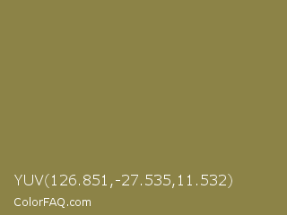 YUV 126.851,-27.535,11.532 Color is a normal yellow color and the nearest color is Dark Tan #918151. Hex code #8c8347 and RGB value is rgb(140,131,71). In RGB color space, this color is composed of 55% red, 51% green, 28% blue, In CMYK color space, this color is composed of 0% cyan, 6% magenta, 49% yellow , 45% black , In HSL color space, this color has a hue angle of 52° , 33% saturation and 41% lightness.