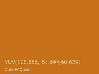 YUV 126.856,-51.694,60.639 Color is a normal orange color and the nearest color is Bourbon #ba6f1e. Hex code #c47016 and RGB value is rgb(196,112,22). In RGB color space, this color is composed of 77% red, 44% green, 9% blue, In CMYK color space, this color is composed of 0% cyan, 43% magenta, 89% yellow , 23% black , In HSL color space, this color has a hue angle of 31° , 80% saturation and 43% lightness.