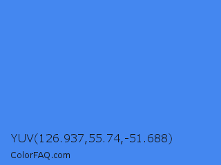 YUV 126.937,55.74,-51.688 Color is a normal blue color and the nearest color is Blueberry #4f86f7. Hex code #4487f0 and RGB value is rgb(68,135,240). In RGB color space, this color is composed of 27% red, 53% green, 94% blue, In CMYK color space, this color is composed of 72% cyan, 44% magenta, 0% yellow , 6% black , In HSL color space, this color has a hue angle of 217° , 85% saturation and 60% lightness.