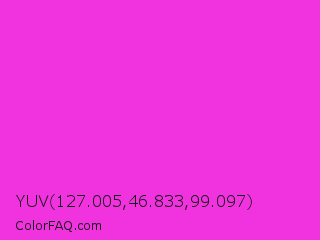 YUV 127.005,46.833,99.097 Color is a normal magenta color and the nearest color is Razzle Dazzle Rose #ff33cc. Hex code #f033de and RGB value is rgb(240,51,222). In RGB color space, this color is composed of 94% red, 20% green, 87% blue, In CMYK color space, this color is composed of 0% cyan, 79% magenta, 8% yellow , 6% black , In HSL color space, this color has a hue angle of 306° , 86% saturation and 57% lightness.