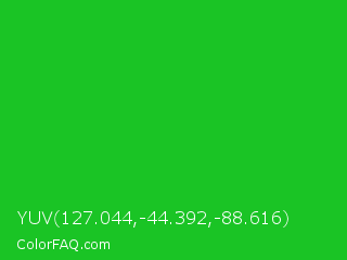 YUV 127.044,-44.392,-88.616 Color is a normal green color and the nearest color is Lime Green #32cd32. Hex code #1ac425 and RGB value is rgb(26,196,37). In RGB color space, this color is composed of 10% red, 77% green, 15% blue, In CMYK color space, this color is composed of 87% cyan, 0% magenta, 81% yellow , 23% black , In HSL color space, this color has a hue angle of 124° , 77% saturation and 44% lightness.