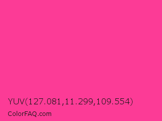 YUV 127.081,11.299,109.554 Color is a light rose color and the nearest color is French Fuchsia #fd3f92. Hex code #fc3b96 and RGB value is rgb(252,59,150). In RGB color space, this color is composed of 99% red, 23% green, 59% blue, In CMYK color space, this color is composed of 0% cyan, 77% magenta, 40% yellow , 1% black , In HSL color space, this color has a hue angle of 332° , 97% saturation and 61% lightness.