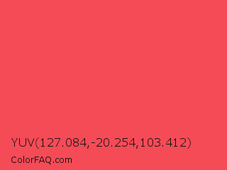 YUV 127.084,-20.254,103.412 Color is a light red color and the nearest color is Tart Orange #fb4d46. Hex code #f54b56 and RGB value is rgb(245,75,86). In RGB color space, this color is composed of 96% red, 29% green, 34% blue, In CMYK color space, this color is composed of 0% cyan, 69% magenta, 65% yellow , 4% black , In HSL color space, this color has a hue angle of 356° , 89% saturation and 63% lightness.