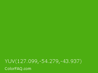 YUV 127.099,-54.279,-43.937 Color is a normal green color and the nearest color is Kelly Green #4cbb17. Hex code #4dae11 and RGB value is rgb(77,174,17). In RGB color space, this color is composed of 30% red, 68% green, 7% blue, In CMYK color space, this color is composed of 56% cyan, 0% magenta, 90% yellow , 32% black , In HSL color space, this color has a hue angle of 97° , 82% saturation and 37% lightness.