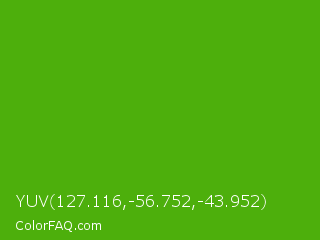 YUV 127.116,-56.752,-43.952 Color is a normal green color and the nearest color is Kelly Green #4cbb17. Hex code #4daf0c and RGB value is rgb(77,175,12). In RGB color space, this color is composed of 30% red, 69% green, 5% blue, In CMYK color space, this color is composed of 56% cyan, 0% magenta, 93% yellow , 31% black , In HSL color space, this color has a hue angle of 96° , 87% saturation and 37% lightness.