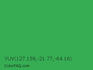 YUV 127.159,-21.77,-64.16 Color is a normal green color and the nearest color is Chateau Green #40a860. Hex code #36ad53 and RGB value is rgb(54,173,83). In RGB color space, this color is composed of 21% red, 68% green, 33% blue, In CMYK color space, this color is composed of 69% cyan, 0% magenta, 52% yellow , 32% black , In HSL color space, this color has a hue angle of 135° , 52% saturation and 45% lightness.