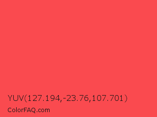 YUV 127.194,-23.76,107.701 Color is a light red color and the nearest color is Tart Orange #fb4d46. Hex code #fa4a4f and RGB value is rgb(250,74,79). In RGB color space, this color is composed of 98% red, 29% green, 31% blue, In CMYK color space, this color is composed of 0% cyan, 70% magenta, 68% yellow , 2% black , In HSL color space, this color has a hue angle of 358° , 95% saturation and 64% lightness.