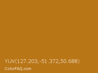 YUV 127.203,-51.372,50.688 Color is a normal orange color and the nearest color is Bourbon #ba6f1e. Hex code #b97617 and RGB value is rgb(185,118,23). In RGB color space, this color is composed of 73% red, 46% green, 9% blue, In CMYK color space, this color is composed of 0% cyan, 36% magenta, 88% yellow , 27% black , In HSL color space, this color has a hue angle of 35° , 78% saturation and 41% lightness.