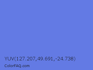 YUV 127.207,49.691,-24.738 Color is a light blue color and the nearest color is United Nations Blue #5b92e5. Hex code #637ae4 and RGB value is rgb(99,122,228). In RGB color space, this color is composed of 39% red, 48% green, 89% blue, In CMYK color space, this color is composed of 57% cyan, 46% magenta, 0% yellow , 11% black , In HSL color space, this color has a hue angle of 229° , 70% saturation and 64% lightness.