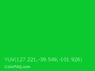 YUV 127.221,-39.549,-101.926 Color is a normal green color and the nearest color is Vivid Malachite #00cc33. Hex code #0bca2f and RGB value is rgb(11,202,47). In RGB color space, this color is composed of 4% red, 79% green, 18% blue, In CMYK color space, this color is composed of 95% cyan, 0% magenta, 77% yellow , 21% black , In HSL color space, this color has a hue angle of 131° , 90% saturation and 42% lightness.