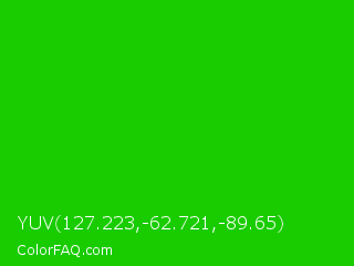 YUV 127.223,-62.721,-89.65 Color is a normal green color and the nearest color is Harlequin Green #46cb18. Hex code #19cc00 and RGB value is rgb(25,204,-0). In RGB color space, this color is composed of 10% red, 80% green, 0% blue, In CMYK color space, this color is composed of 88% cyan, 0% magenta, 100% yellow , 20% black , In HSL color space, this color has a hue angle of 113° , 100% saturation and 40% lightness.