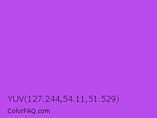 YUV 127.244,54.11,51.529 Color is a light purple color and the nearest color is Medium Orchid #ba55d3. Hex code #ba4ced and RGB value is rgb(186,76,237). In RGB color space, this color is composed of 73% red, 30% green, 93% blue, In CMYK color space, this color is composed of 22% cyan, 68% magenta, 0% yellow , 7% black , In HSL color space, this color has a hue angle of 281° , 82% saturation and 61% lightness.