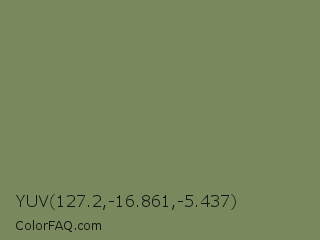YUV 127.2,-16.861,-5.437 Color is a normal green color and the nearest color is Flax Smoke #7b8265. Hex code #79895d and RGB value is rgb(121,137,93). In RGB color space, this color is composed of 47% red, 54% green, 36% blue, In CMYK color space, this color is composed of 12% cyan, 0% magenta, 32% yellow , 46% black , In HSL color space, this color has a hue angle of 82° , 19% saturation and 45% lightness.