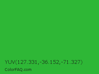 YUV 127.331,-36.152,-71.327 Color is a normal green color and the nearest color is Wageningen Green #34b233. Hex code #2eb736 and RGB value is rgb(46,183,54). In RGB color space, this color is composed of 18% red, 72% green, 21% blue, In CMYK color space, this color is composed of 75% cyan, 0% magenta, 70% yellow , 28% black , In HSL color space, this color has a hue angle of 124° , 60% saturation and 45% lightness.