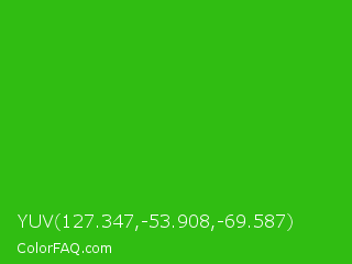 YUV 127.347,-53.908,-69.587 Color is a normal green color and the nearest color is Harlequin Green #46cb18. Hex code #30bd12 and RGB value is rgb(48,189,18). In RGB color space, this color is composed of 19% red, 74% green, 7% blue, In CMYK color space, this color is composed of 75% cyan, 0% magenta, 90% yellow , 26% black , In HSL color space, this color has a hue angle of 109° , 83% saturation and 41% lightness.