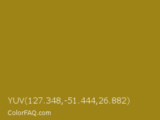 YUV 127.348,-51.444,26.882 Color is a normal yellow color and the nearest color is Reef Gold #9f821c. Hex code #9e8417 and RGB value is rgb(158,132,23). In RGB color space, this color is composed of 62% red, 52% green, 9% blue, In CMYK color space, this color is composed of 0% cyan, 16% magenta, 85% yellow , 38% black , In HSL color space, this color has a hue angle of 48° , 75% saturation and 35% lightness.