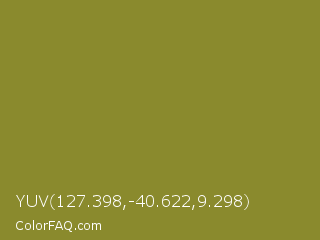 YUV 127.398,-40.622,9.298 Color is a normal yellow color and the nearest color is Sycamore #908d39. Hex code #8a8a2d and RGB value is rgb(138,138,45). In RGB color space, this color is composed of 54% red, 54% green, 18% blue, In CMYK color space, this color is composed of 0% cyan, 0% magenta, 67% yellow , 46% black , In HSL color space, this color has a hue angle of 60° , 51% saturation and 36% lightness.