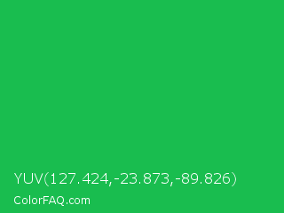 YUV 127.424,-23.873,-89.826 Color is a normal green color and the nearest color is Dark Pastel Green #03c03c. Hex code #19bd4f and RGB value is rgb(25,189,79). In RGB color space, this color is composed of 10% red, 74% green, 31% blue, In CMYK color space, this color is composed of 87% cyan, 0% magenta, 58% yellow , 26% black , In HSL color space, this color has a hue angle of 140° , 77% saturation and 42% lightness.