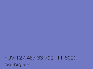 YUV 127.457,33.792,-11.802 Color is a light blue color and the nearest color is Toolbox #746cc0. Hex code #7279c4 and RGB value is rgb(114,121,196). In RGB color space, this color is composed of 45% red, 47% green, 77% blue, In CMYK color space, this color is composed of 42% cyan, 38% magenta, 0% yellow , 23% black , In HSL color space, this color has a hue angle of 235° , 41% saturation and 61% lightness.