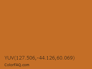 YUV 127.506,-44.126,60.069 Color is a normal orange color and the nearest color is Liver Dogs #b86d29. Hex code #c46e26 and RGB value is rgb(196,110,38). In RGB color space, this color is composed of 77% red, 43% green, 15% blue, In CMYK color space, this color is composed of 0% cyan, 44% magenta, 81% yellow , 23% black , In HSL color space, this color has a hue angle of 27° , 68% saturation and 46% lightness.