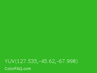YUV 127.535,-45.62,-67.998 Color is a normal green color and the nearest color is Wageningen Green #34b233. Hex code #32b923 and RGB value is rgb(50,185,35). In RGB color space, this color is composed of 20% red, 73% green, 14% blue, In CMYK color space, this color is composed of 73% cyan, 0% magenta, 81% yellow , 27% black , In HSL color space, this color has a hue angle of 114° , 68% saturation and 43% lightness.