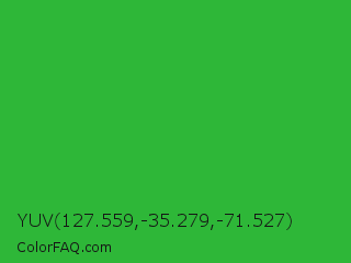 YUV 127.559,-35.279,-71.527 Color is a normal green color and the nearest color is Wageningen Green #34b233. Hex code #2eb738 and RGB value is rgb(46,183,56). In RGB color space, this color is composed of 18% red, 72% green, 22% blue, In CMYK color space, this color is composed of 75% cyan, 0% magenta, 69% yellow , 28% black , In HSL color space, this color has a hue angle of 124° , 60% saturation and 45% lightness.