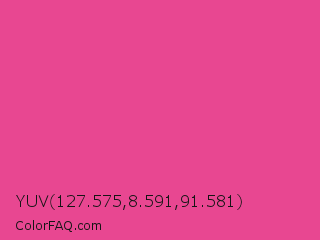 YUV 127.575,8.591,91.581 Color is a normal rose color and the nearest color is Raspberry Pink #e25098. Hex code #e84791 and RGB value is rgb(232,71,145). In RGB color space, this color is composed of 91% red, 28% green, 57% blue, In CMYK color space, this color is composed of 0% cyan, 69% magenta, 38% yellow , 9% black , In HSL color space, this color has a hue angle of 332° , 78% saturation and 59% lightness.