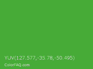 YUV 127.577,-35.78,-50.495 Color is a normal green color and the nearest color is Apple #4fa83d. Hex code #46ab37 and RGB value is rgb(70,171,55). In RGB color space, this color is composed of 27% red, 67% green, 22% blue, In CMYK color space, this color is composed of 59% cyan, 0% magenta, 68% yellow , 33% black , In HSL color space, this color has a hue angle of 112° , 51% saturation and 44% lightness.