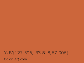 YUV 127.596,-33.818,67.006 Color is a normal orange color and the nearest color is Medium Vermilion #d9603b. Hex code #cc663b and RGB value is rgb(204,102,59). In RGB color space, this color is composed of 80% red, 40% green, 23% blue, In CMYK color space, this color is composed of 0% cyan, 50% magenta, 71% yellow , 20% black , In HSL color space, this color has a hue angle of 18° , 59% saturation and 52% lightness.