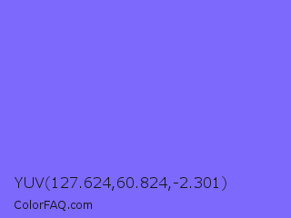 YUV 127.624,60.824,-2.301 Color is a light indigo color and the nearest color is Medium Slate Blue #7b68ee. Hex code #7d69fb and RGB value is rgb(125,105,251). In RGB color space, this color is composed of 49% red, 41% green, 98% blue, In CMYK color space, this color is composed of 50% cyan, 58% magenta, 0% yellow , 2% black , In HSL color space, this color has a hue angle of 248° , 95% saturation and 70% lightness.