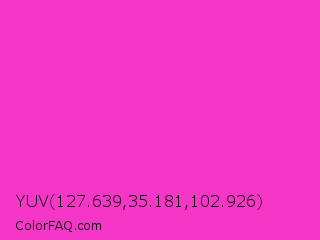 YUV 127.639,35.181,102.926 Color is a normal magenta color and the nearest color is Razzle Dazzle Rose #ff33cc. Hex code #f536c7 and RGB value is rgb(245,54,199). In RGB color space, this color is composed of 96% red, 21% green, 78% blue, In CMYK color space, this color is composed of 0% cyan, 78% magenta, 19% yellow , 4% black , In HSL color space, this color has a hue angle of 314° , 91% saturation and 59% lightness.