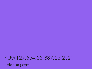 YUV 127.654,55.387,15.212 Color is a light indigo color and the nearest color is Navy Purple #9457eb. Hex code #9161f0 and RGB value is rgb(145,97,240). In RGB color space, this color is composed of 57% red, 38% green, 94% blue, In CMYK color space, this color is composed of 40% cyan, 60% magenta, 0% yellow , 6% black , In HSL color space, this color has a hue angle of 260° , 83% saturation and 66% lightness.