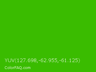 YUV 127.698,-62.955,-61.125 Color is a normal green color and the nearest color is Kelly Green #4cbb17. Hex code #3abc00 and RGB value is rgb(58,188,-0). In RGB color space, this color is composed of 23% red, 74% green, 0% blue, In CMYK color space, this color is composed of 69% cyan, 0% magenta, 100% yellow , 26% black , In HSL color space, this color has a hue angle of 101° , 100% saturation and 37% lightness.