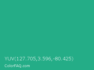 YUV 127.705,3.596,-80.425 Color is a normal green color and the nearest color is Jungle Green #29ab87. Hex code #24ad87 and RGB value is rgb(36,173,135). In RGB color space, this color is composed of 14% red, 68% green, 53% blue, In CMYK color space, this color is composed of 79% cyan, 0% magenta, 22% yellow , 32% black , In HSL color space, this color has a hue angle of 163° , 66% saturation and 41% lightness.