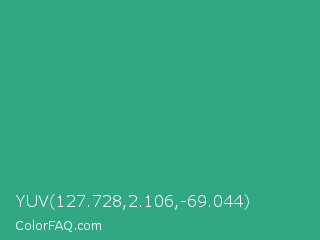 YUV 127.728,2.106,-69.044 Color is a normal green color and the nearest color is Jungle Green #29ab87. Hex code #31a784 and RGB value is rgb(49,167,132). In RGB color space, this color is composed of 19% red, 65% green, 52% blue, In CMYK color space, this color is composed of 71% cyan, 0% magenta, 21% yellow , 35% black , In HSL color space, this color has a hue angle of 162° , 55% saturation and 42% lightness.