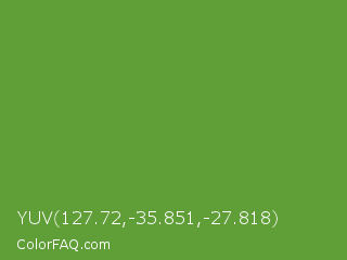 YUV 127.72,-35.851,-27.818 Color is a normal green color and the nearest color is Palm Leaf #6f9940. Hex code #609e37 and RGB value is rgb(96,158,55). In RGB color space, this color is composed of 38% red, 62% green, 22% blue, In CMYK color space, this color is composed of 39% cyan, 0% magenta, 65% yellow , 38% black , In HSL color space, this color has a hue angle of 96° , 48% saturation and 42% lightness.