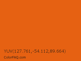 YUV 127.761,-54.112,89.664 Color is a normal orange color and the nearest color is Vivid Vermilion #e56024. Hex code #e66112 and RGB value is rgb(230,97,18). In RGB color space, this color is composed of 90% red, 38% green, 7% blue, In CMYK color space, this color is composed of 0% cyan, 58% magenta, 92% yellow , 10% black , In HSL color space, this color has a hue angle of 22° , 85% saturation and 49% lightness.