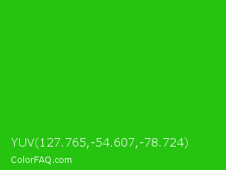 YUV 127.765,-54.607,-78.724 Color is a normal green color and the nearest color is Harlequin Green #46cb18. Hex code #26c311 and RGB value is rgb(38,195,17). In RGB color space, this color is composed of 15% red, 76% green, 7% blue, In CMYK color space, this color is composed of 81% cyan, 0% magenta, 91% yellow , 24% black , In HSL color space, this color has a hue angle of 113° , 84% saturation and 42% lightness.