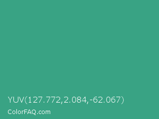 YUV 127.772,2.084,-62.067 Color is a normal green color and the nearest color is Zomp #39a78e. Hex code #39a384 and RGB value is rgb(57,163,132). In RGB color space, this color is composed of 22% red, 64% green, 52% blue, In CMYK color space, this color is composed of 65% cyan, 0% magenta, 19% yellow , 36% black , In HSL color space, this color has a hue angle of 162° , 48% saturation and 43% lightness.