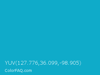 YUV 127.776,36.099,-98.905 Color is a normal cyan color and the nearest color is Pacific Blue #1ca9c9. Hex code #0fabc9 and RGB value is rgb(15,171,201). In RGB color space, this color is composed of 6% red, 67% green, 79% blue, In CMYK color space, this color is composed of 93% cyan, 15% magenta, 0% yellow , 21% black , In HSL color space, this color has a hue angle of 190° , 86% saturation and 42% lightness.