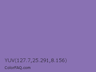YUV 127.7,25.291,8.156 Color is a normal violet color and the nearest color is Middle Blue Purple #8b72be. Hex code #8971b3 and RGB value is rgb(137,113,179). In RGB color space, this color is composed of 54% red, 44% green, 70% blue, In CMYK color space, this color is composed of 23% cyan, 37% magenta, 0% yellow , 30% black , In HSL color space, this color has a hue angle of 262° , 30% saturation and 57% lightness.