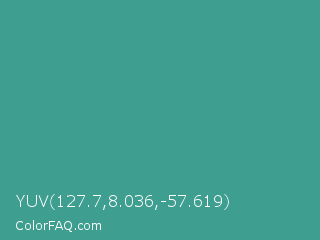 YUV 127.7,8.036,-57.619 Color is a normal cyan color and the nearest color is Zomp #39a78e. Hex code #3e9e90 and RGB value is rgb(62,158,144). In RGB color space, this color is composed of 24% red, 62% green, 56% blue, In CMYK color space, this color is composed of 61% cyan, 0% magenta, 9% yellow , 38% black , In HSL color space, this color has a hue angle of 171° , 44% saturation and 43% lightness.