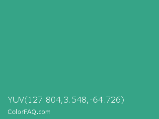 YUV 127.804,3.548,-64.726 Color is a normal cyan color and the nearest color is Zomp #39a78e. Hex code #36a487 and RGB value is rgb(54,164,135). In RGB color space, this color is composed of 21% red, 64% green, 53% blue, In CMYK color space, this color is composed of 67% cyan, 0% magenta, 18% yellow , 36% black , In HSL color space, this color has a hue angle of 164° , 50% saturation and 43% lightness.