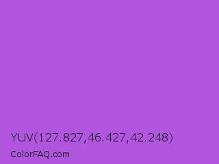 YUV 127.827,46.427,42.248 Color is a normal purple color and the nearest color is Medium Orchid #ba55d3. Hex code #b055de and RGB value is rgb(176,85,222). In RGB color space, this color is composed of 69% red, 33% green, 87% blue, In CMYK color space, this color is composed of 21% cyan, 62% magenta, 0% yellow , 13% black , In HSL color space, this color has a hue angle of 280° , 67% saturation and 60% lightness.