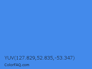 YUV 127.829,52.835,-53.347 Color is a normal blue color and the nearest color is Tufts Blue #3e8ede. Hex code #438aeb and RGB value is rgb(67,138,235). In RGB color space, this color is composed of 26% red, 54% green, 92% blue, In CMYK color space, this color is composed of 71% cyan, 41% magenta, 0% yellow , 8% black , In HSL color space, this color has a hue angle of 215° , 81% saturation and 59% lightness.