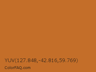 YUV 127.848,-42.816,59.769 Color is a normal orange color and the nearest color is Liver Dogs #b86d29. Hex code #c46e29 and RGB value is rgb(196,110,41). In RGB color space, this color is composed of 77% red, 43% green, 16% blue, In CMYK color space, this color is composed of 0% cyan, 44% magenta, 79% yellow , 23% black , In HSL color space, this color has a hue angle of 27° , 65% saturation and 46% lightness.