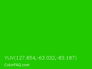 YUV 127.854,-63.032,-83.187 Color is a normal green color and the nearest color is Harlequin Green #46cb18. Hex code #21c900 and RGB value is rgb(33,201,-0). In RGB color space, this color is composed of 13% red, 79% green, 0% blue, In CMYK color space, this color is composed of 84% cyan, 0% magenta, 100% yellow , 21% black , In HSL color space, this color has a hue angle of 110° , 100% saturation and 39% lightness.