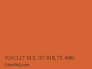 YUV 127.913,-37.918,75.498 Color is a normal orange color and the nearest color is Medium Vermilion #d9603b. Hex code #d66333 and RGB value is rgb(214,99,51). In RGB color space, this color is composed of 84% red, 39% green, 20% blue, In CMYK color space, this color is composed of 0% cyan, 54% magenta, 76% yellow , 16% black , In HSL color space, this color has a hue angle of 18° , 67% saturation and 52% lightness.
