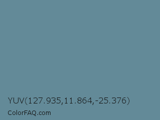 YUV 127.935,11.864,-25.376 Color is a normal blue color and the nearest color is Hoki #65869f. Hex code #638a98 and RGB value is rgb(99,138,152). In RGB color space, this color is composed of 39% red, 54% green, 60% blue, In CMYK color space, this color is composed of 35% cyan, 9% magenta, 0% yellow , 40% black , In HSL color space, this color has a hue angle of 196° , 21% saturation and 49% lightness.