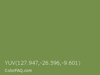 YUV 127.947,-26.596,-9.601 Color is a normal green color and the nearest color is Palm Leaf #6f9940. Hex code #75904a and RGB value is rgb(117,144,74). In RGB color space, this color is composed of 46% red, 56% green, 29% blue, In CMYK color space, this color is composed of 19% cyan, 0% magenta, 49% yellow , 44% black , In HSL color space, this color has a hue angle of 83° , 32% saturation and 43% lightness.